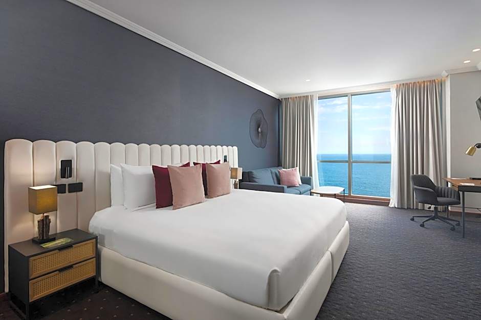 The Suites feature a full room area for relaxation and entertainment, separate bedroom with sea view, where guests can receive visits or business meetings from the comfort of your room. It includes bathrobe and slippers, shower and hot tub, guest bathroom, ergonomic chair, two LCD plasma televisions with cable, full living room, use of executive meeting room (on request, subject to availability). Also has a mini fridge, electric coffee maker and free coffee.